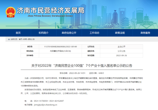 10月(yue)20日,濟南市(shi)民營經濟發(fa)展局、濟南市(shi)工商業(ye)(ye)聯(lian)合會共同發(fa)布“2022年(nian)濟南民營企業(ye)(ye)100強”及7個產(chan)業(ye)(ye)十強系列(lie)榜單